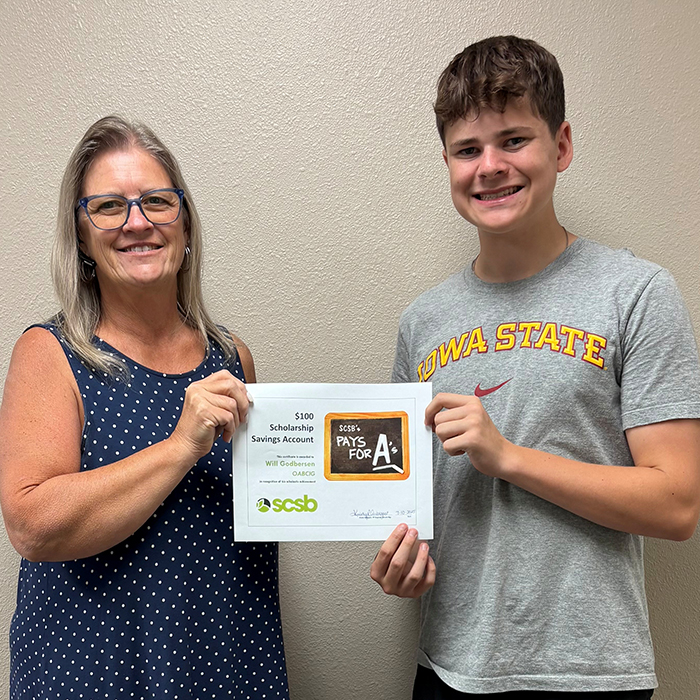 SCSB rewards hardworking middle school and high school students every semester with our “Pays for A’s” program. To enter, students can bring their semester report card to any SCSB branch to submit their “A” grades for scholarship entries. Entrants will receive a $5 Gift Card as well as scholarship entries for every "A" they’ve earned. Scholarship drawing winners are awarded a $100 Scholarship Savings Account and are randomly drawn among the SCSB’s six area schools, in conjunction with other surrounding area schools. At the end of the school year, all eligible entries are combined for a final Grand Prize Drawing for one of (2) $1,000 Scholarship Savings Accounts. Please contact Janet Buman at 712-755-5112 or jbuman@scsbnet.com with any questions about the SCSB “Pays for A’s” program.